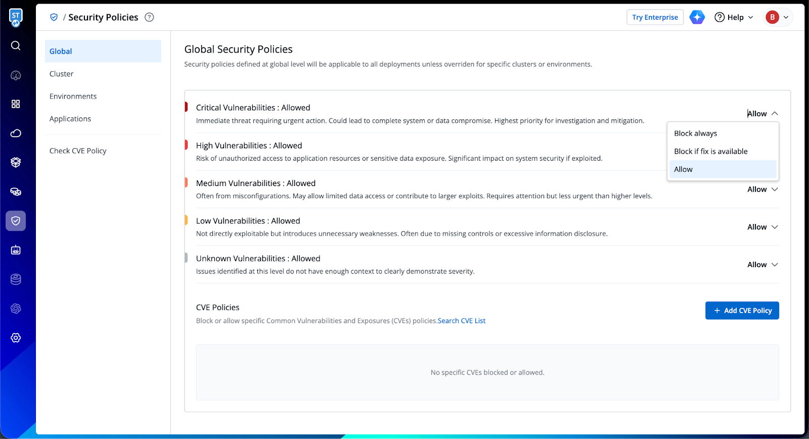 Set different policies for different contexts, finance apps get stricter rules than internal tools, and production requires more approvals than dev. Apply policies at the global, cluster, environment, or application level. They enforce automatically because they're part of the deployment, not documentation.