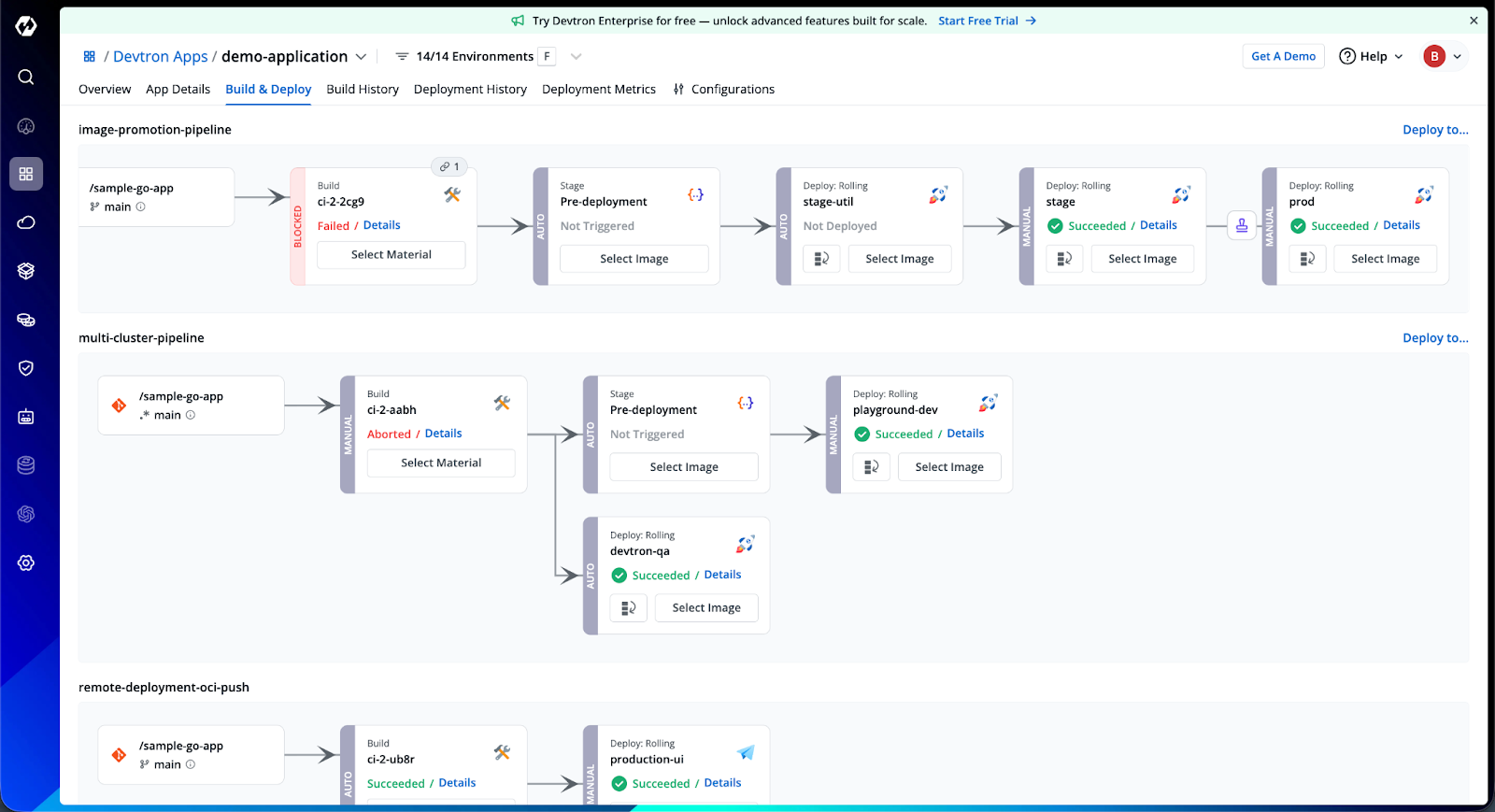 Devtron combines CI and CD in a single interface. Build, deploy, and manage releases without correlating timestamps across systems. Everything pipelines actually need, database migrations, pre/post-deployment tasks, notifications, lives in the pipeline definition, not in scripts hidden across repositories.